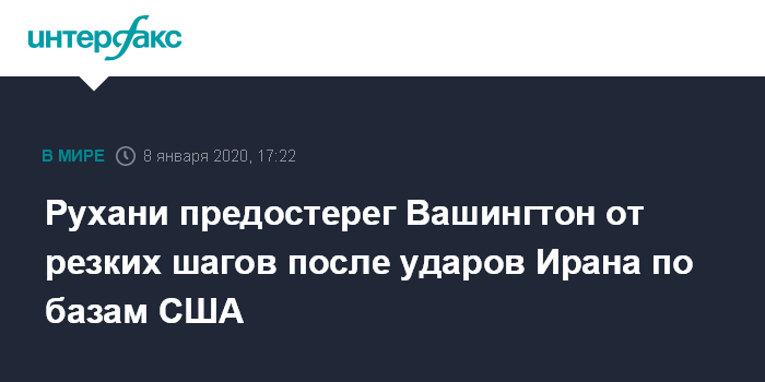 Москва. 8 января. INTERFAX.RU - Власти США не будут предпринимать дальнейших резких шагов против Ирана, если решат действовать мудро, заявил в среду президент Ирана Хасан Рухани.