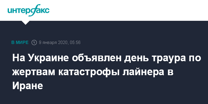 "В связи с трагедией, произошедшей вследствие катастрофы пассажирского самолета частного акционерного общества "Авиакомпания "Международные авиалинии Украины" 8 января 2020 года в Исламской Республике Иран и привела к многочисленным человеческим жертвам, с целью чествования памяти погибших постановляю объявить в Украине 9 января 2020 года днем траура", - говорится в сообщении.
