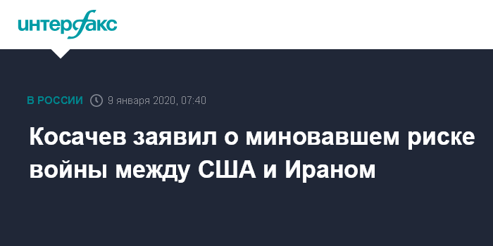 Москва. 9 января. INTERFAX.RU - Риск возникновения крупномасштабных военных действий из-за обострения ситуации на Ближнем Востоке миновал, считает глава Комитета Совета Федерации по международным делам Константин Косачев.