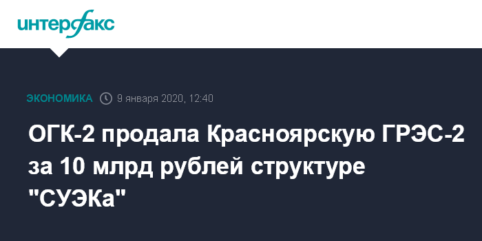 Москва. 9 января. INTERFAX.RU - ПАО "ОГК-2" продало Красноярскую ГРЭС-2 структуре "Сибирской генерирующей компании" (СГК) - АО "Енисейская ТГК" за 10 млрд рублей, сообщили компании.