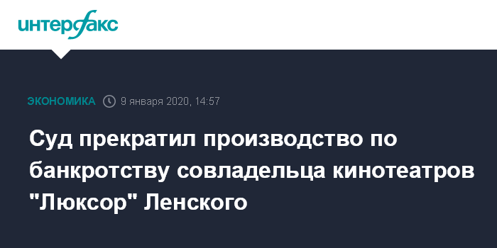 Москва. 9 января. INTERFAX.RU - Арбитражный суд Москвы в декабре прошлого года прекратил производство по делу о банкротстве совладельца кинотеатров "Люксор" Евгения Ленского, следует из картотеки суда.