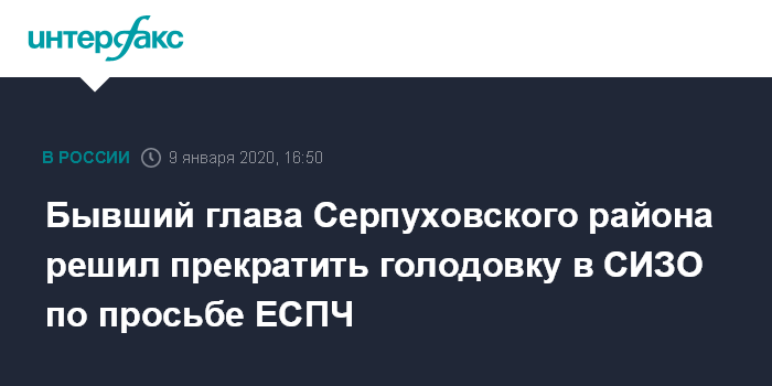 Москва. 9 января. INTERFAX.RU - Бывший глава Серпуховского района Подмосковья Александр Шестун, который находится в СИЗО с лета 2018 года, согласился прекратить голодовку по рекомендации ЕСПЧ и чтобы его не кормили принудительно. Как сообщила его адвокат Алла Кульбаева, он обещал написать заявление о "сходе" с голодовки.