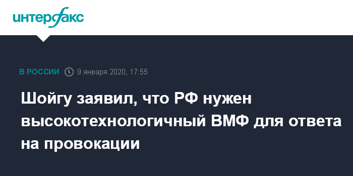 Москва. 9 января. INTERFAX.RU - Россия развивает высокотехнологичный Военно-морской флот (ВМФ), в том числе и для того, чтобы ни один провокационный вызов не остался без ответа, заявил министр обороны РФ Сергей Шойгу.