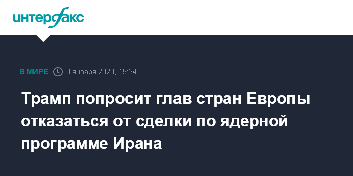 Накануне Трамп, выступая в связи с ракетным обстрелом Ираном иракских баз, заявил в Белом доме, что странам-участницам соглашения с Ираном по атому необходимо осознать реалии и выйти из него. "Франции, Великобритании, Германии, России, Китаю нужно осознать реальность и выйти из того, что осталось от соглашения по атому, известному как СВПД", - сказал Трамп.