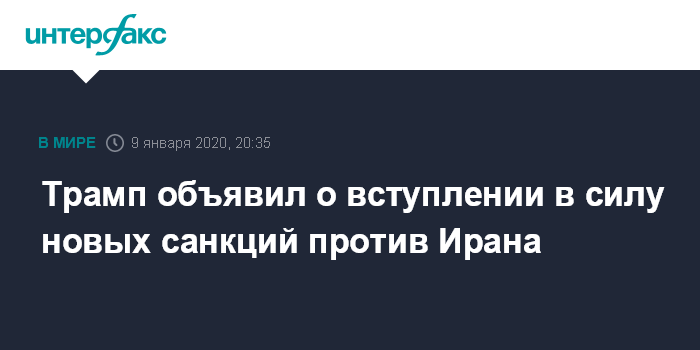 Москва. 9 января. INTERFAX.RU - Президент США Дональд Трамп в четверг объявил, что американские санкции против Тегерана, анонсированные после ракетного удара Ирана по иракским базам, уже действуют.