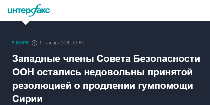 Москва. 11 января. INTERFAX.RU - Западные члены Совета Безопасности ООН остались недовольны компромиссной резолюцией о продлении на полгода трансграничной гумпомощи Сирии и обвинили Россию в политизации гуманитарной темы.