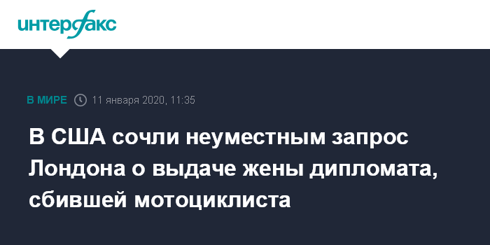 Москва. 11 января. INTERFAX.RU - В Госдепе США назвали неуместным запрос Великобритании об экстрадиции жены американского дипломата Энн Сакулас, которая, предположительно, сбила насмерть 19-летнего мотоциклиста Гарри Данна в августе прошлого года. Об этом сообщает телеканал CBS News.