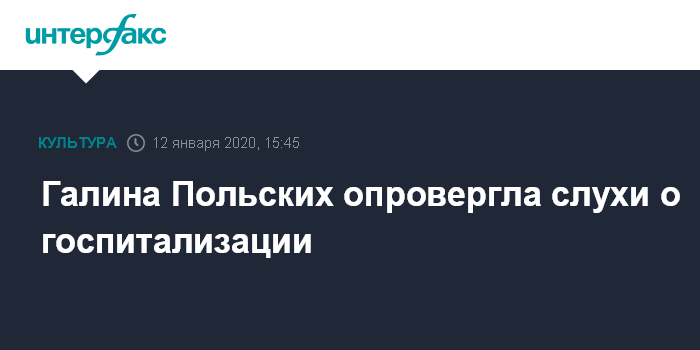 Москва. 12 января. INTERFAX.RU - Актриса театра и кино Галина Польских опровергла "Интерфаксу" в воскресенье информацию о своей госпитализации.