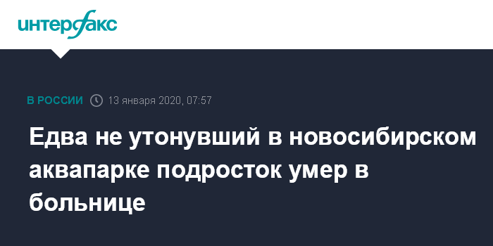 Москва. 13 января. INTERFAX.RU - Подросток, захлебнувшийся в новосибирском аквапарке "Аквамир" 8 января, скончался в больнице в ночь на понедельник, сообщили агентству "Интерфакс" в пресс-службе Минздрава региона.