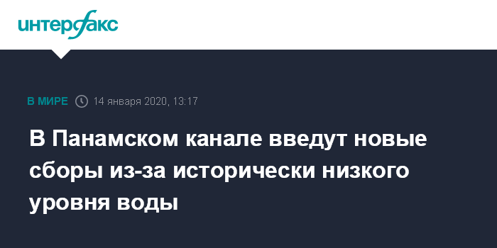 Москва. 14 января. INTERFAX.RU - Администрация Панамского канала вводит новые сборы за проход судов в связи с исторически низким уровнем воды в озере Гатун, которое является основным источником воды для заполнения канала.