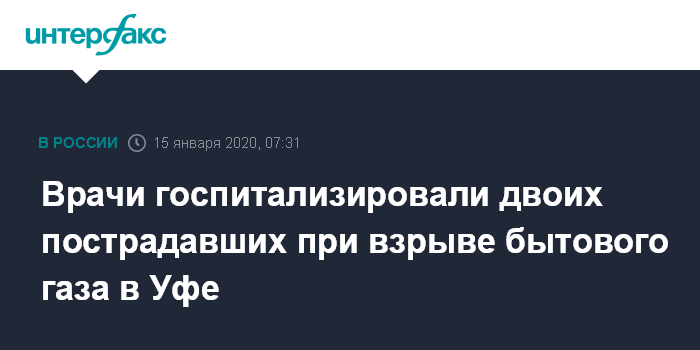 Москва. 15 января. INTERFAX.RU - Три человека, в числе которых ребенок, доставлены в больницы Уфы после взрыва бытового газа в жилой двухэтажке, один из взрослых в тяжелом состоянии, сообщил агентству "Интерфакс" сотрудник Минздрава Башкирии.