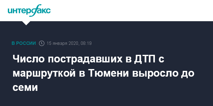 Москва. 15 января. INTERFAX.RU - В Тюмени после столкновения маршрутного такси с легковой машины пострадали семь человек, их доставили в городскую больницу №2, сообщили в пресс-службе регионального Минздрава. Ранее источник "Интерфакса" сообщал о шести пострадавших.