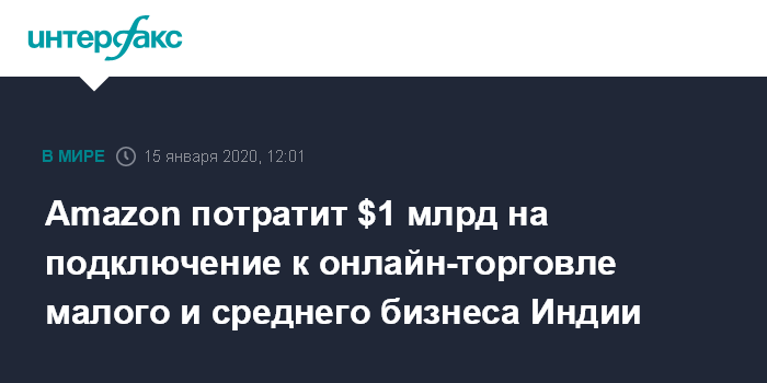 Москва. 15 января. INTERFAX.RU - Amazon выделит $1 млрд на то, чтобы вывести малый и средний бизнес Индии на рынок онлайн-торговли, заявил основатель компании Джефф Безос на мероприятии в Нью-Дели.