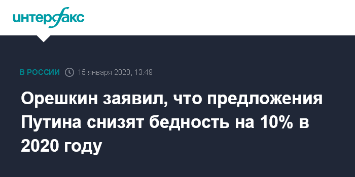 Москва. 15 января. INTERFAX.RU - Прозвучавшие в Послании Федеральному собранию предложения президента РФ Владимира Путина приведут к снижению бедности в России на 10% в 2020 году, сообщил министр экономического развития РФ Максим Орешкин.