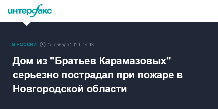 Москва. 15 января. INTERFAX.RU - Дом в городе Старая Русса в Новгородской области, описанный Федором Достоевским в романе "Братья Карамазовы", серьезно поврежден при пожаре, сообщили "Интерфаксу" в пресс-службе регионального управления МЧС в среду.