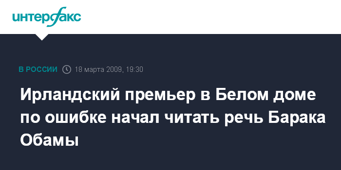 Лондон. 18 марта. INTERFAX.RU - Премьер-министр Ирландии Брайан Коуэн попал в нелепую ситуацию, когда, выступая в Белом доме, по ошибке начал читать текст речи президента США Барака Обамы, пишет в среду британская газета Times.