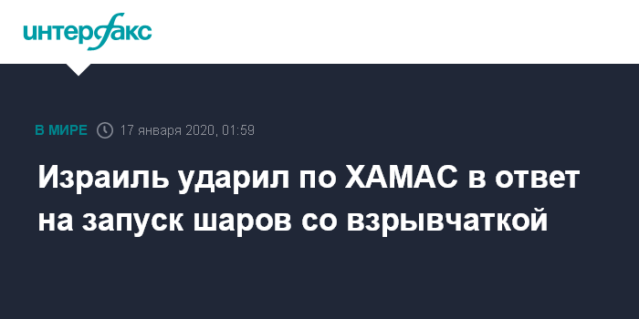 Москва. 17 января. INTERFAX.RU - Военные Израиля нанесли удар по объектам ХАМАС в ответ на воздушные шары с взрывчаткой, запускаемые в течение дня с территории сектора Газа.