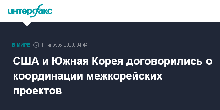 Москва. 17 января. INTERFAX.RU - Южная Корея и США договорились о координации возможных межкорейских проектов на фоне застопорившихся ядерных переговоров между Вашингтоном и Пхеньяном, заявил в четверг спецпредставитель Южной Кореи по КНДР Ли До Хун.