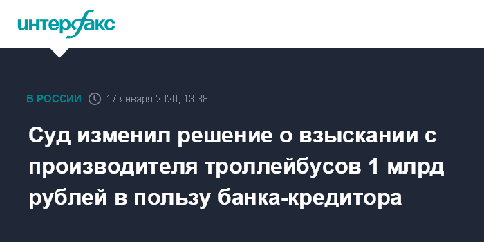 Суд изменил решение о взыскании с производителя троллейбусов 1 млрд рублей в пользу банка-кредитора