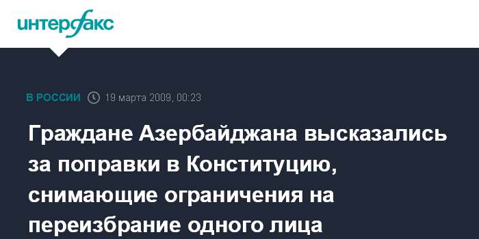 Баку. 19 марта. ИНТЕРФАКС-АЗЕРБАЙДЖАН - Азербайджанские граждане на прошедшем 18 марта референдуме высказались за проект поправок и дополнений в Конституцию, в том числе, снимающие ограничения на переизбрание одного лица президентом более двух раз.