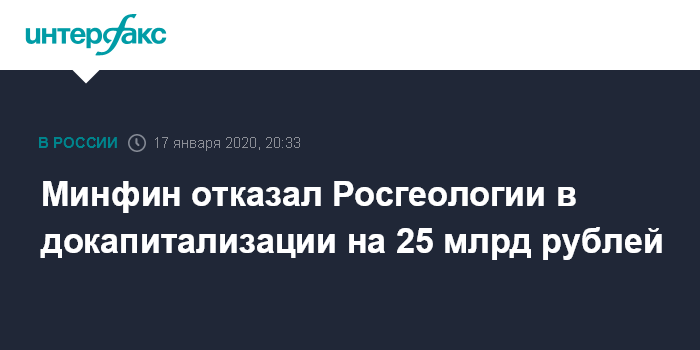 По данным источника "Интерфакса", отрицательное заключение Минфина было подготовлено в середине января. Между тем, в пресс-службе "Росгеологии" "Интерфаксу" сообщили, что 17 января состоялась рабочая встреча главы "Росгеологии" Сергея Горькова с исполняющим обязанности первого вице-премьера - министра финансов Антоном Силуановым. "По итогам встречи принято решение продолжить обсуждение проблем, связанных с докапитализацией геологоразведочного холдинга, а также других вопросов, связанных с поддержкой "Росгеологии" со стороны ее акционера", - сказали в компании.