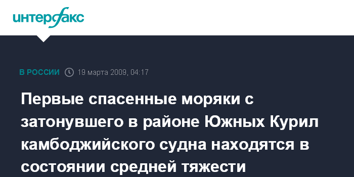 Южно-Сахалинск. 19 марта. ИНТЕРФАКС - ДАЛЬНИЙ ВОСТОК - Двое спасенных моряков с затонувшего минувшей ночью иностранного судна "Кисука" под флагом Камбоджи находятся в состоянии средней тяжести из-за переохлаждения.
