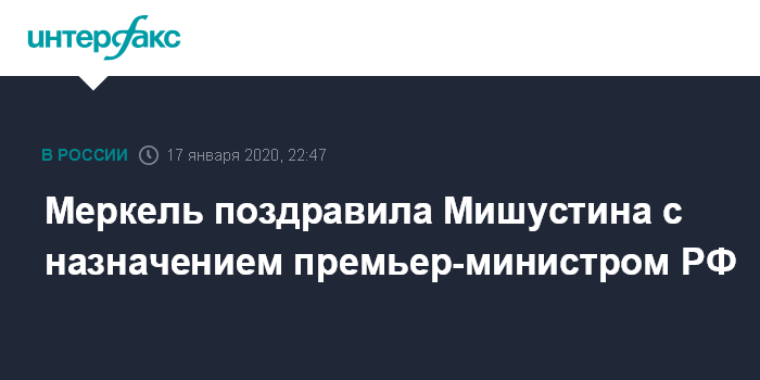 Москва. 17 января. INTERFAX.RU - Канцлер Германии Ангела Меркель поздравила Михаила Мишустина со вступлением в должность премьер-министра РФ и выразила заинтересованность в развитии отношений с РФ.
