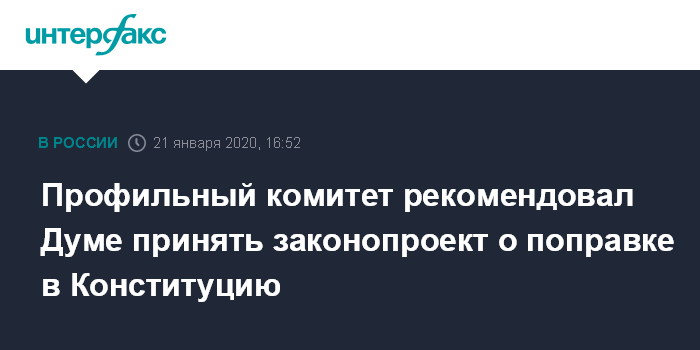 Москва. 21 января. INTERFAX.RU - Комитет Госдумы по конституционному законодательству и государственному строительству на заседании во вторник рекомендовал Думе принять в первом чтении президентский законопроект о поправке к Конституции.