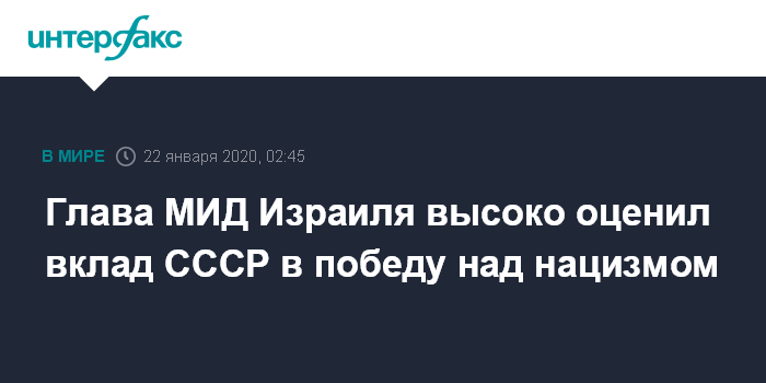 Москва. 22 января. INTERFAX.RU - Израиль признает ведущую роль СССР в победе над нацизмом и помнит о героизме солдат Красной армии, заявил в интервью газете "Известия" министр иностранных дел и разведки Израиля, член военно-политического кабинета Исраэль Кац.