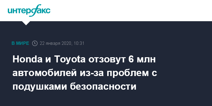 Москва. 22 января. INTERFAX.RU - Японские автопроизводители Toyota и Honda отзывают более 6 млн автомобилей из-за двух разных проблем с подушками безопасности, представляющих угрозу для водителей.