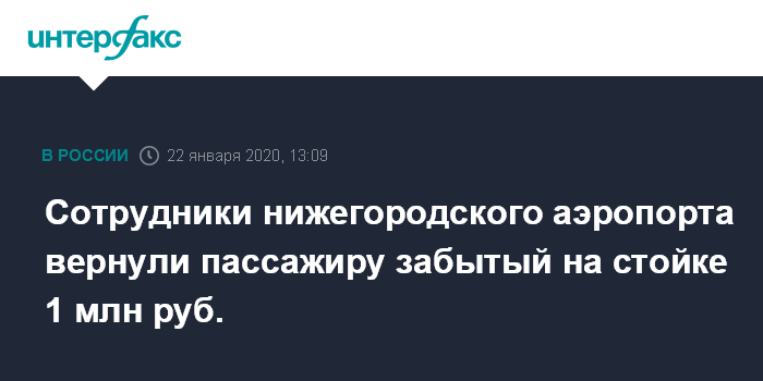 Москва. 22 января. INTERFAX.RU - Пассажиру вернули сумку с миллионом рублей, забытую им у стойки регистрации в аэропорту Нижнего Новгорода, сообщили "Интерфаксу" в пресс-службе воздушной гавани.