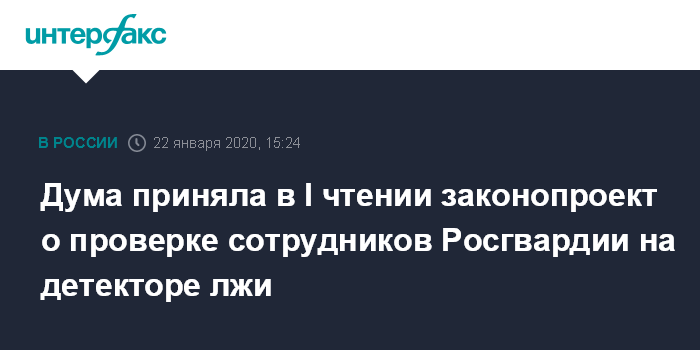 Москва. 22 января. INTERFAX.RU - Госдума в среду приняла в первом чтении законопроект о проверке сотрудников Росгвардии на полиграфе.