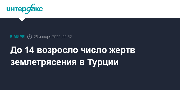 Москва. 25 января. INTERFAX.RU - Землетрясение в провинции Элязыг на востоке Турции привело, по последним данным, к гибели по меньшей мере 14 человек, сообщает турецкое агентство Anadolu со ссылкой на управление по борьбе со стихийными бедствиями и чрезвычайным ситуациям Турции.