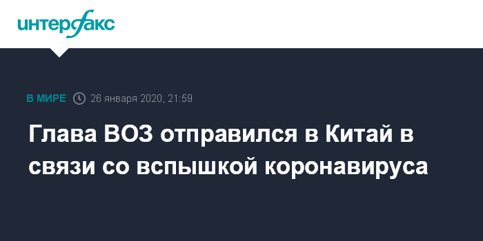 Москва. 26 января. INTERFAX.RU - Глава Всемирной организации здравоохранения (ВОЗ) Тедрос Адханом Гебрейесус отправился в Китай в связи со вспышкой пневмонии нового типа.