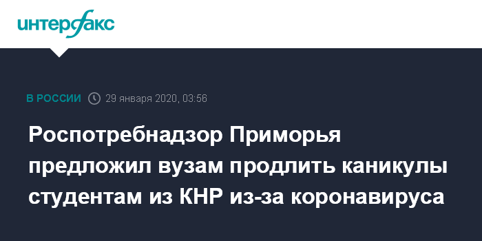 Москва. 29 января. INTERFAX.RU - Управление Роспотребнадзора по Приморскому краю рекомендует вузам продлить каникулы для студентов из Китая из-за нового коронавируса.