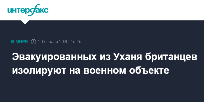 Москва. 29 января. INTERFAX.RU - Британское правительство собирается вывезти из Уханя около 200 сограждан, которых затем вне зависимости от состояния здоровья изолируют на 14 дней. Источники BBC News и Daily Telegraph говорит, что карантин могут организовать на военном объекте.