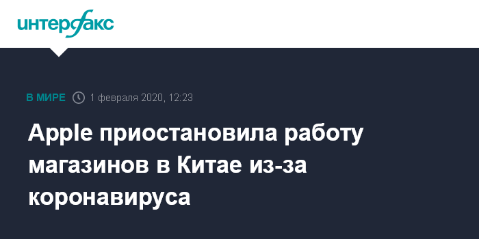 Москва. 1 февраля. INTERFAX.RU - Американская компания Apple решила приостановить работу своих офисов и магазинов в Китае из-за зафиксированной там вспышки коронавируса, сообщает в субботу Bloomberg.