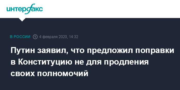 Москва. 4 февраля. INTERFAX.RU - Президент РФ Владимир Путин заявил, что предложенные им поправки в Конституцию РФ были сделаны не для продления его полномочий.