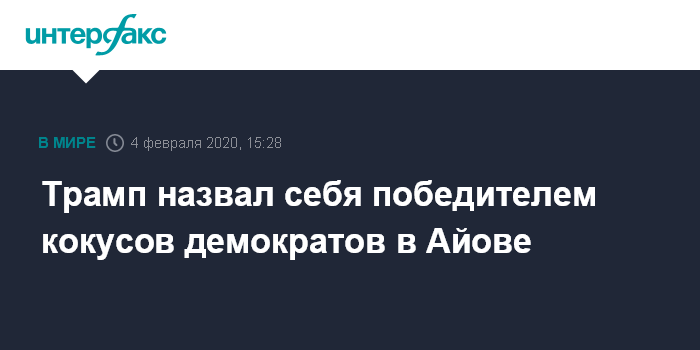 Москва. 4 февраля. INTERFAX.RU - Президент США Дональд Трамп упрекнул Демократическую партию в неспособности провести внутрипартийные кокусы в Айове, где подсчет голосов сорвался из-за технического сбоя. В твиттере он назвал себя единственным победителем этих кокусов.