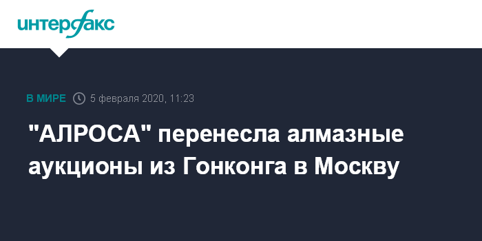 Москва. 5 февраля. INTERFAX.RU - "АЛРОСА" сообщила, что перенесет из Гонконга в другие города мартовские аукционы по продаже алмазов специальных размеров (более 10,8 карата) и бриллиантов. Торги намечались в рамках ежегодной ювелирной выставки, однако организаторы в Гонконге решили отложить ее с марта до второй половины мая.