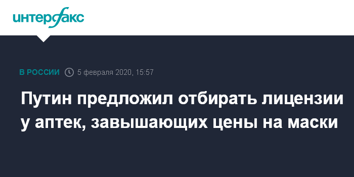 Москва. 5 февраля. INTERFAX.RU - Президент РФ Владимир Путин заявил, что у аптек, повысивших цены на противовирусные препараты и маски, следует отбирать лицензии.