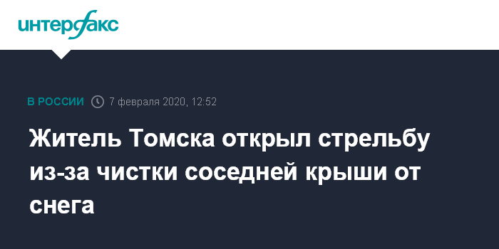 Москва. 7 февраля. INTERFAX.RU - Житель частного сектора в Томске открыл стрельбу из-за того, что при чистке крыши соседней стоматологической клиники на улице Гагарина рабочий сбросил снег на его двор. Об этом рассказал главврач клиники Алексей Федоров. Никто не пострадал.