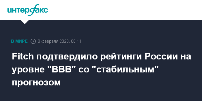 Москва. 8 февраля. INTERFAX.RU - Международное рейтинговое агентство Fitch подтвердило долгосрочные рейтинги дефолта эмитента (РДЭ) Российской Федерации в национальной и иностранной валютах на уровне "BBB".