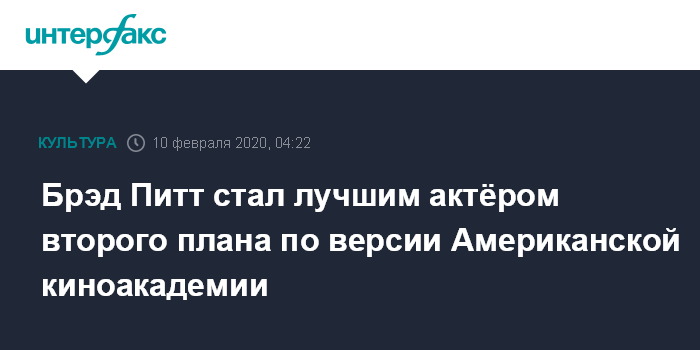 Москва. 10 февраля. INTERFAX.RU - Брэд Питт получил свой первый "Оскар" как лучший актёр второго плана за роль дублера Клиффа Бута в фильме "Однажды в.. Голливуде" Квентина Тарантино.