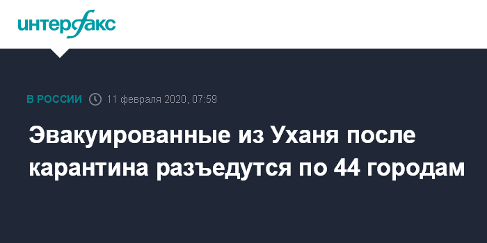 Москва. 11 февраля. INTERFAX.RU - По предварительным данным, россияне и иностранцы, находящиеся на карантине по коронавирусу после эвакуации из Уханя, планируют затем уехать в 44 города, сообщил тюменский областной штаб по профилактике коронавируса. Штаб собирает информацию о планах эвакуированных.