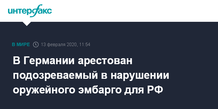 Москва. 13 февраля. INTERFAX.RU - Генпрокуратура Германии выдала ордер на арест гражданина этой страны Александра С., подозреваемого в нарушении эмбарго на поставки военного оборудования и оборудования двойного назначения в Россию, сообщает в четверг пресс-служба ведомства.