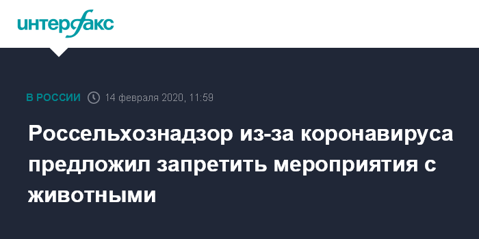 Согласно документу Россельхознадзора, который направлен в территориальные управления службы и с которым ознакомился "Интерфакс", предлагается, в частности, временно, до выяснения источников, путей и способов распространения "уханьского" вируса, запретить выставочные и культурно-массовые мероприятия, на которых демонстрируются животные, в том числе и дикие.