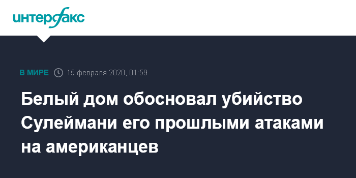 Москва. 15 февраля. INTERFAX.RU - Президент США Дональд Трамп отдал приказ на проведение операции по ликвидации командующего иранским подразделением Корпуса стражей исламской революции (КСИР) Касема Сулеймани в ответ на ранее осуществленные им атаки на американские объекты и их персонал, говорится в служебной записке, распространенной Белым домом.