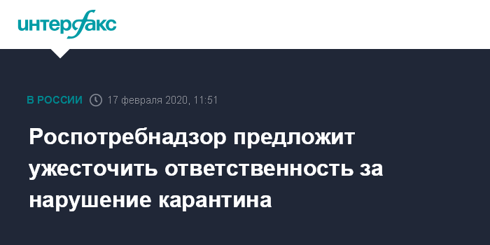 Москва. 17 февраля. INTERFAX.RU - Руководитель Роспотребнадзора, главный санитарный врач РФ Анна Попова считает, что назрел вопрос об усилении ответственности за нарушение карантинного режима в России.