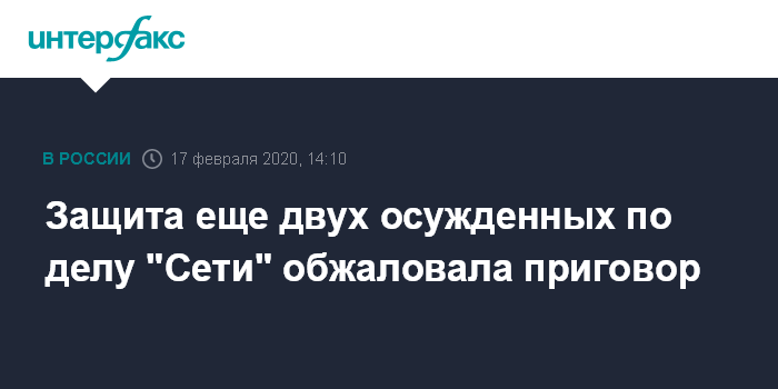 Москва. 17 февраля. INTERFAX.RU - Адвокаты еще двух фигурантов дела запрещенной в РФ организации "Сеть" подали апелляционные жалобы на приговор, вынесенный Приволжским окружным военным судом.